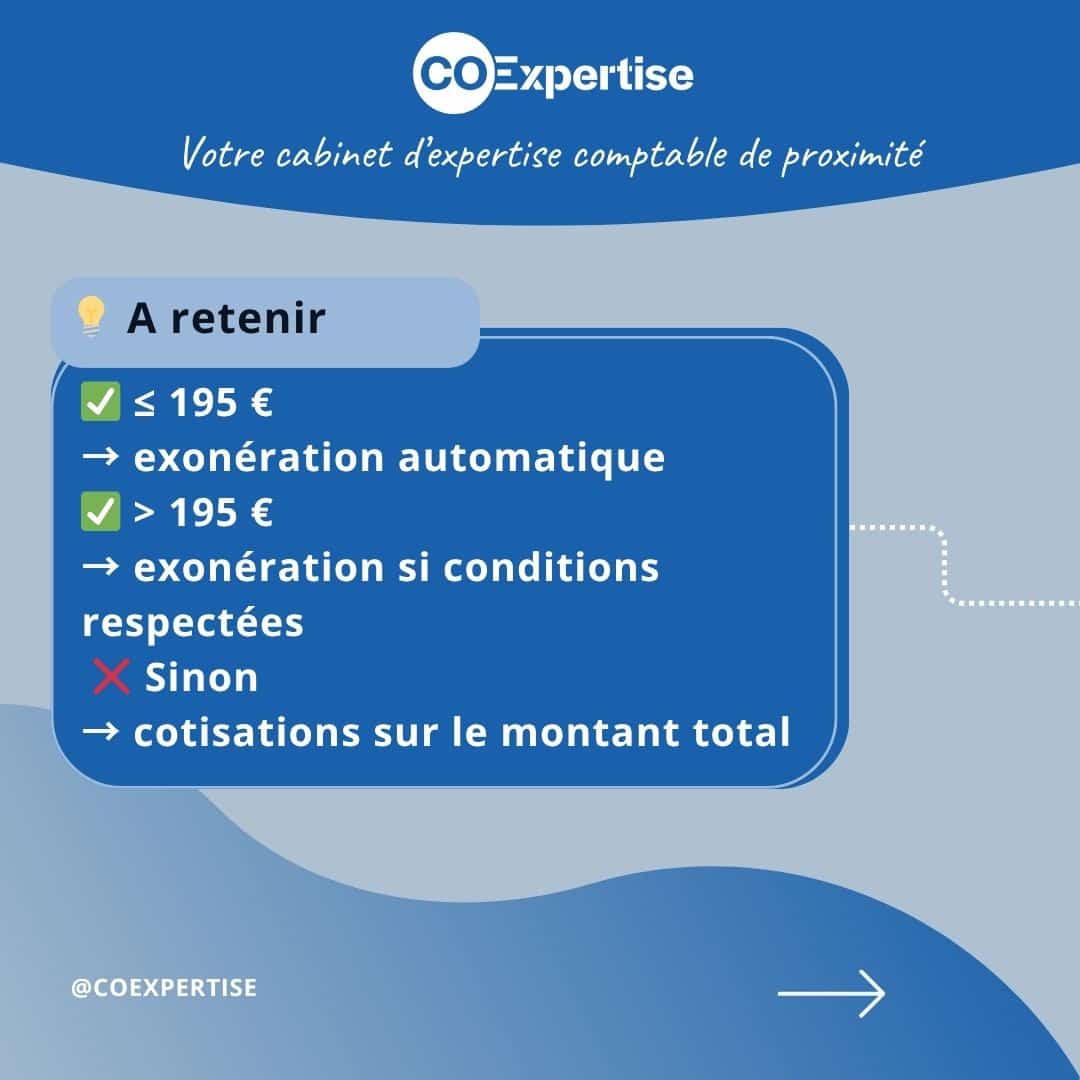 - En dessous de 195€ (5% du PMSS 2025) : exonération automatique.